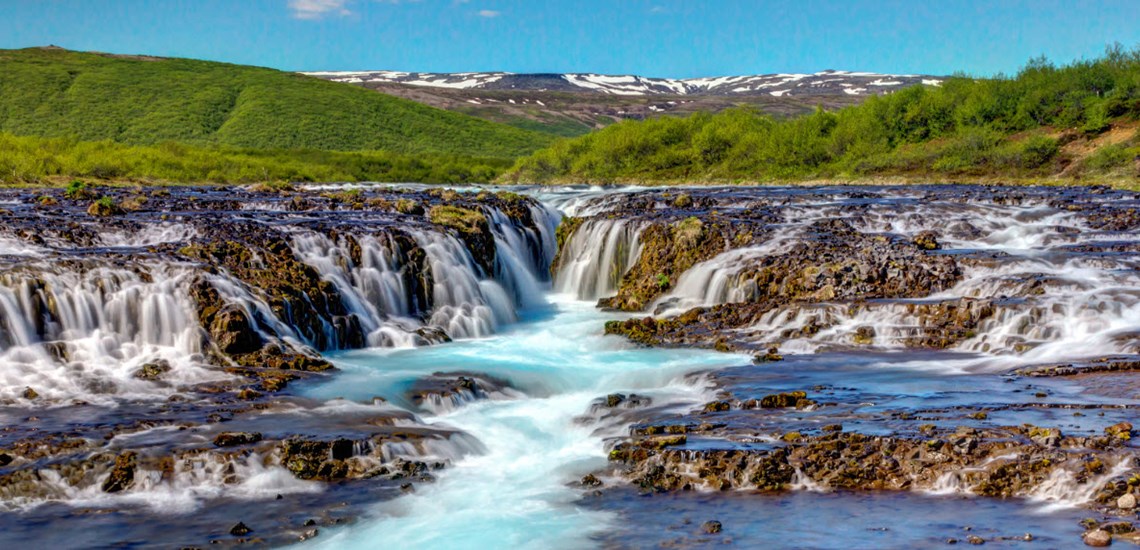 The waterfall Brúarárfoss is in many ways very different from many other waterfalls in Iceland. The river Brúará runs wide above the waterfall and then the water falls into a narrow crack in the middle of the riverbed, the crack goes a little bit wider further down until it takes in almost all the water coming down the river. This makes the water white and blue, making the colour and the movement of the water dynamic, just perfect for photographing.
