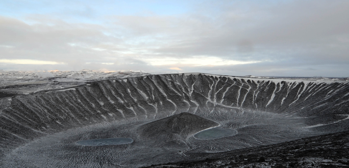 It is believed to have formed in a volcanic eruption for around 2500 to 3000 years ago, Hverfjall (Hverfell) belongs to the Krafla volcanic fissure swarm and is located on the south part of it. The formation of Hverfjall (Hverfell) is believed to be the beginning of a long lasting volcanic activity in the volcano Krafla fissure swarm. Highest point of Hverfjall (Hverfell) is 402 m, about 170 meters above its surrounding.